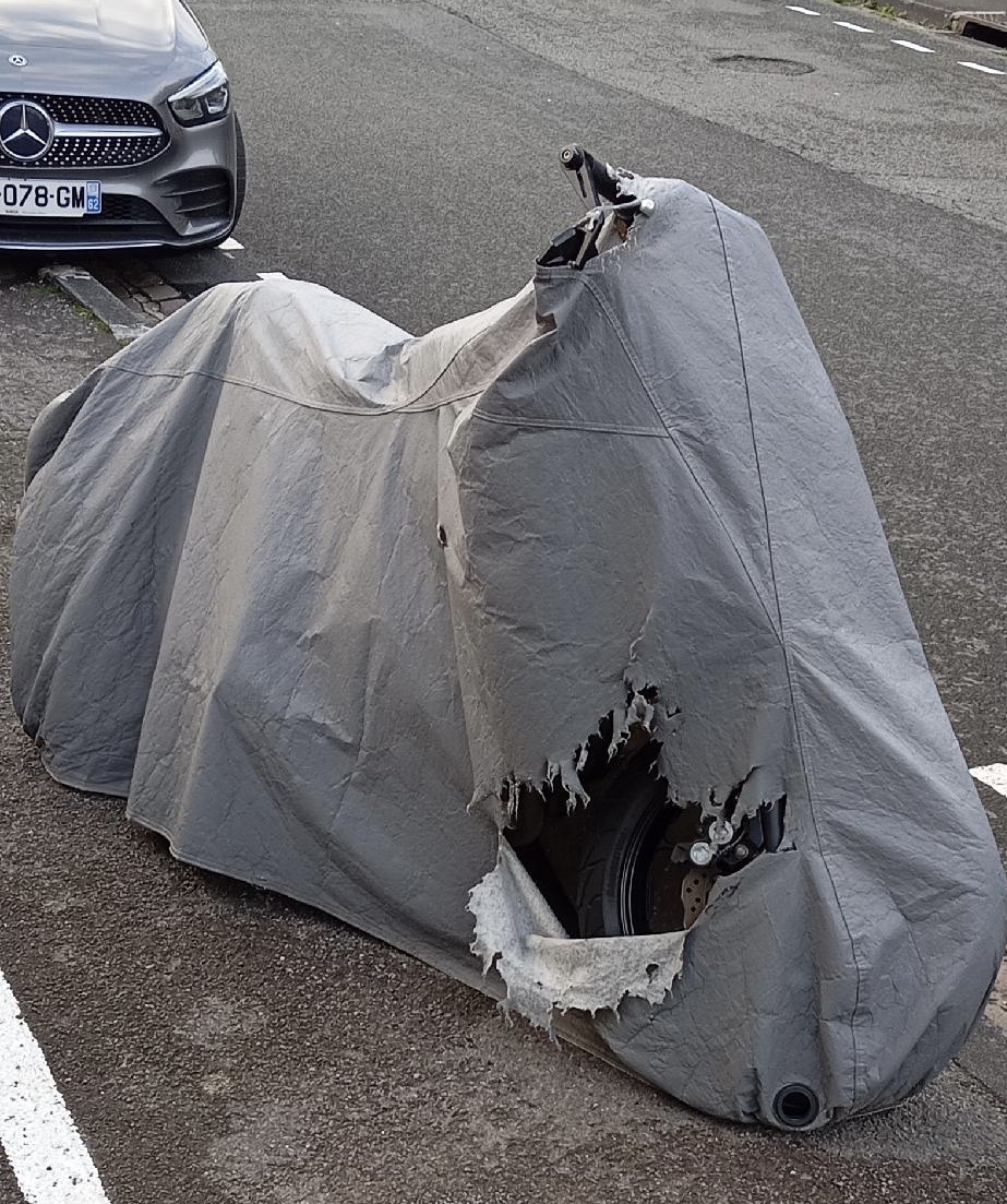 Cela fait plus d'un an, sinon deux, que ce deux-roues squatte un emplacement de stationnement dans une rue de la ville très fréquentée par des visiteurs d'un jour ou d'une heure. En s'approchant un peu on s'aperçoit qu'il n'est plus du tout en état de circuler. C'est un fait. Et sans vraiment s'approcher on s'aperçoit aussi que cette vision n'augure pas d'une belle image de la ville: