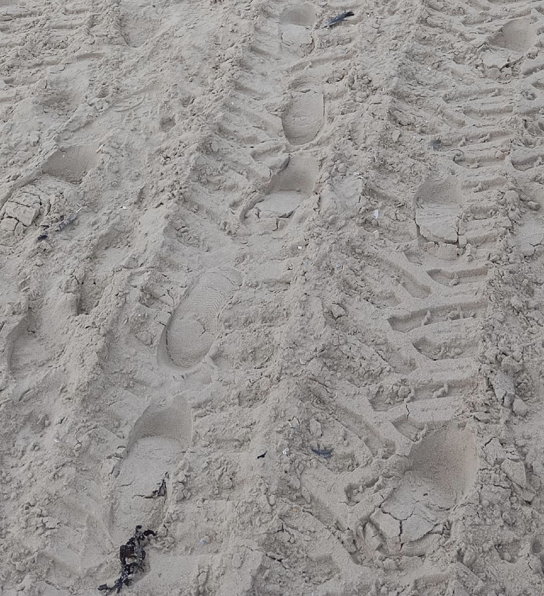 Seuls de très rares marcheurs tentent d’éviter les ornières tracées dans le sable, à l’évidence par un engin quatre-quatre si l’on s’en tient aux traces de pneus.